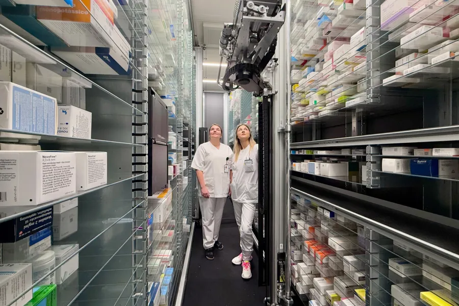 Sykehusapoteket er utstyrt med en avansert lagerrobot som revolusjonerer måten legemidler oppbevares og håndteres på.